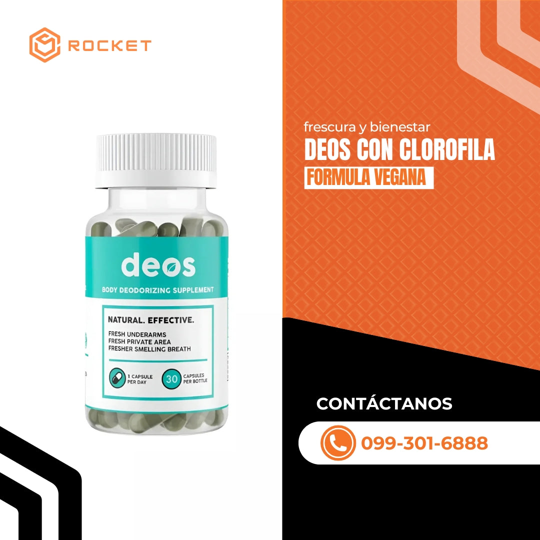 Deos es un suplemento desodorizante corporal a base de clorofila, pensado para quienes quieren sentirse frescos por dentro y por fuera durante todo el día.Fórmula vegana con clorofila, ideal para estilos de vida saludables
